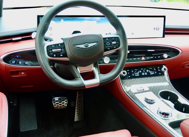 The interior of the new GV70 offers an all-new 27-inch OLED display that integrates the gauge cluster and updated infotainment system into a single expansive horizontal layout.