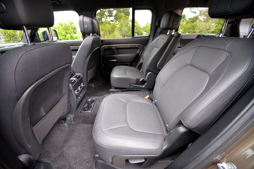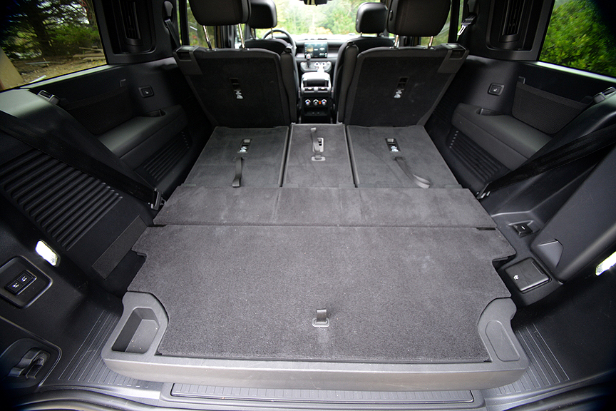 Our $106,092 test Rover was fitted with $1000 optional "heated and cooled second row Capt. Chairs with hinged headrests." While these luxury loungers might make your back seat occupants happy, they will interfere with maximum storage space in the event you need to fold rows two and three flat. The problem with the Captain's Chairs is they don't fold fully flat due to the added storage height of the hinged headrests. This in turn causes you to snag awkward loads on various protuberances, as I discovered when trying to load my mountain bike through the swing-out tailgate door. I'd pass on the Captain's Chairs and go for a split back bench for row two.