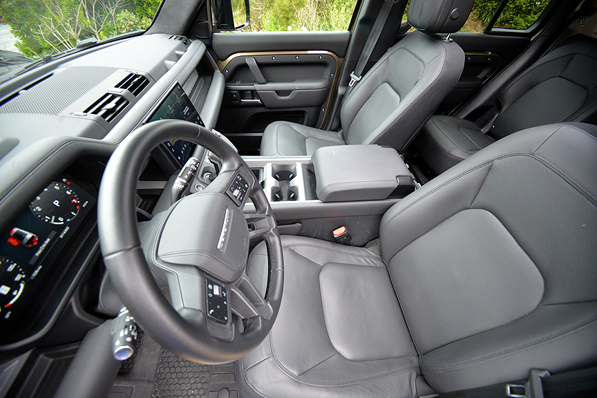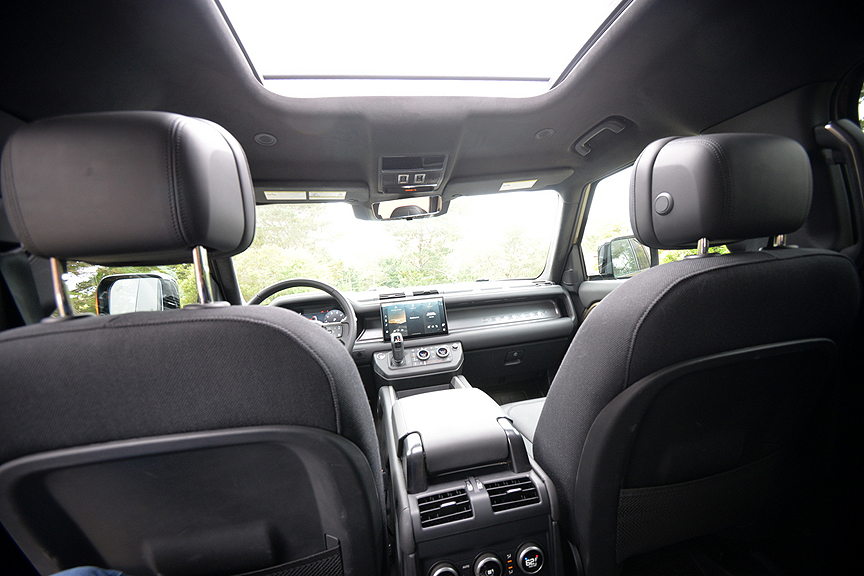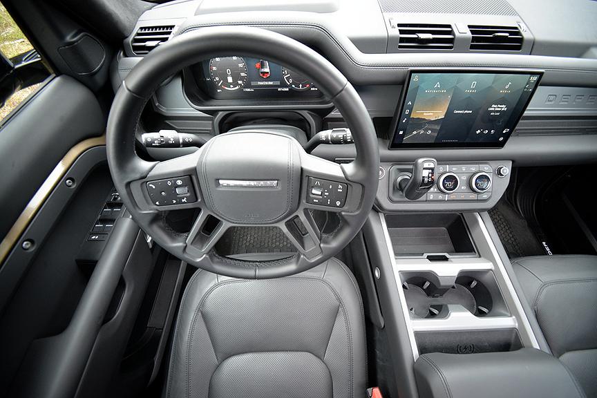 Adding to the calming effect was the ample bump insulation provided by the high sidewall height of 130 X's 20 inch (255/60 R20) Pirelli Scorpion Zero M&S radials. The spacious cabin's ultra plush interior, furnished in Ebony Windsor Leather, also helped soothe the eyes and calm the soul. You can even dial up a dozen different interior lighting scenarios to match your mood shifts. As an added bonus, the Defender's 3.0-liter, turbocharged, six-cylinder gas engine, which produces 395hp and 406lb.-ft. of torque, proved more than adequate to any acceleration demands made of its chauffeur. For the record, this big rig is capable of posting 6.2-second runs to 60mph, while top speed runs out at 119mph.