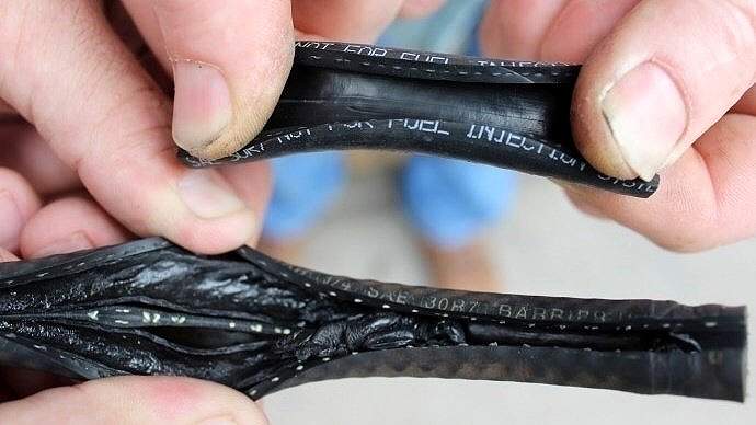 He talks about rubber hoses used in older vehicles, and he posted a photograph that displays two pieces of rubber hoses. The hose at the top ostensibly implies a hose that was subjected only to gasoline, and the bottom hose implies a hose that was damaged by ethanol. Here's the picture he used: