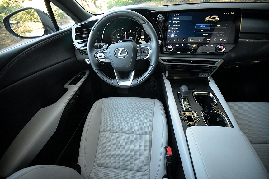 Compared to non-hybrid RX models, all the hybrid versions include a mammoth 14-inch, high-definition multi-information touchscreen, which is 1.7 inches larger than the standard screen available on non-hybrid RX models. We found that the jumbo screen made the task of pressing the desired digital button easier to perform. However, the large ignition Start/Stop button is hidden behind the upper quadrant of the steering wheel. To confuse the issue further, the similarly sized button for the HVAC system lies in plain sight where the Start Stop button should have been located in the first place.