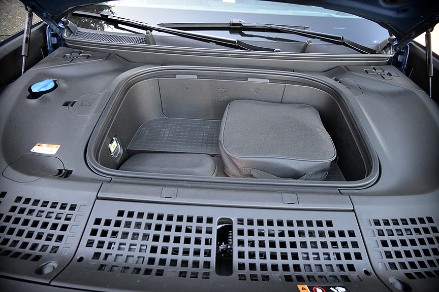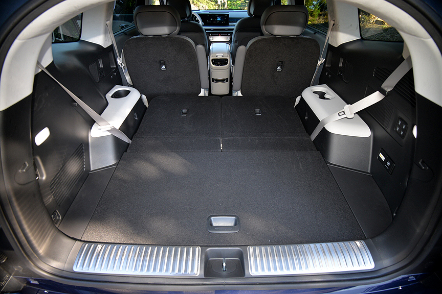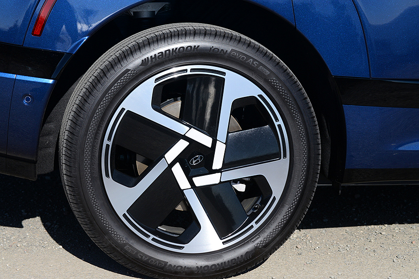 Predictably, the 9's alloy wheels are pie-plate flat discs measuring 21 x 9J, incised with a bizarre-looking 5-spoke geometric pattern sure to confirm instant status in the EV club. Mounted on these rims are enormous (and enormously expensive) 285/45R21 Hankook ION EVO SUV radials with "EV Sound Absorber" lettering emblazoned on their sidewalls. While these extra heavy-duty tires (TW 600) may mute road chatter, they communicate bumps and heaves with unfailing accuracy. We found the Performance version of the Ioniq 9, equipped with self-leveling dampers, to be jarring over pockmarked surfaces. Even the utterly luxurious "Relaxation Seats" of the Calligraphy model can't compensate for the rambunctious ride quality of the Performance I-9.