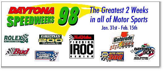 1998 Daytona Speedweeks![]() Daytona Speedweeks® is a registered trademark of International Speedway Corporation. The Auto Channel is not affiliated with International Speedway Corporation Daytona Speedweeks consist of several races sanctioned by a variety of associations: NASCAR, ARCA,IROC, and the newly formed USRRC (United States Road Racing Championship). Speedweeks concludes with the annual Running of NASCAR's Daytona 500 on February 15th. The Auto Channel's comprehensive coverage will include live and taped TV and radio reports, live video and audio interviews, text stories, live simulcasts of radio coverage provided by local radio stations, and extensive photographs.