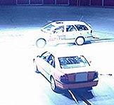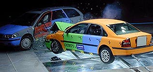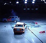 | The new safety center will enable engineers to test and study the reactions of the various Volvo's, when a large moveable object is hit at high speeds. The picture above is an S80 mid-impact in an offset "Elk test." | |