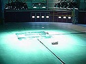 The process was mesmerizing and almost surreal. First, all of the lights were turned off. Then, the large block of 8,000-watt daylight photo lamps, suspended above the glass were slowly turned on and lowered from the ceiling. A total of 32 lights brighten the glass square that, going from a bright blue to an almost-blinding clear glow, the entire building was hollow and silent, except for a low hum.