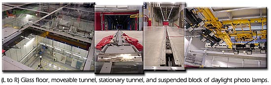 After the briefing, we were escorted into the massive testing room. Two long tunnels connect to a multi-level center that has an open and enclosed observation deck. Two tracks join together at a large glass-bottom floor that houses numerous high-speed cameras and lights.