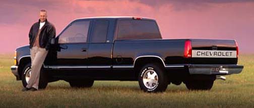APPEARANCE: The big Chevy pickup has no pretensions to being anything but a truck. "Massive" is the word that comes to mind when gazing at it. Form follows function, and the boxy design means good space utilization. The corners and edges are slightly rounded, but the current automotive aero-look is conspicuously absent. Chrome, in amounts not seen on mere cars in years, abounds from the front bumper and massive egg-crate grille through trim on the sides to the heavy-duty rear bumper. The passenger-side third door available on extended-cab models is inconspicuous when closed. It is hinged at the rear, allowing a wide opening for easy interior access. The "Fleetside" pickup box is a modern, full-width design with small flares over the rear wheels, and the "Sportside" box is the retro-look narrow box with external fenders. Four-by-four trucks sit higher than their two-wheel brethren, and a variety of wheels are offered.