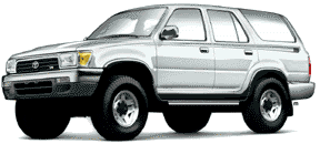 OUTSIDE - Muscular and looking every bit a rugged four-wheeler, 4Runner now looks even closer to Toyota's top-line Land Cruiser luxury SUV. It now uses larger headlights and outside mirrors, along with wider front and rear door openings. With a two-inch longer wheelbase and an overall length that's been stretched by nearly three inches, the new 4Runner's extensive outside modifications not only enhanced its appearance, but make things less cramped inside. Replacing the previous model's two-piece tailgate is a single swing-up door with a power window, and a lowering of the cargo floor height by over three inches makes loading "stuff" in back is much easier. 4Runner's standard tires are large 225/75R15 all-season radials, including the spare, which is located under the rear of the vehicle. Steel wheels are standard; alloy wheels are offered optionally.