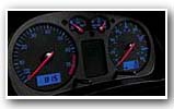 When the sun goes down the Passat's dash lights up in a very cool cobalt blue. Couple that with the red needle and peripheral vision reading of the tach is a breeze.. .
