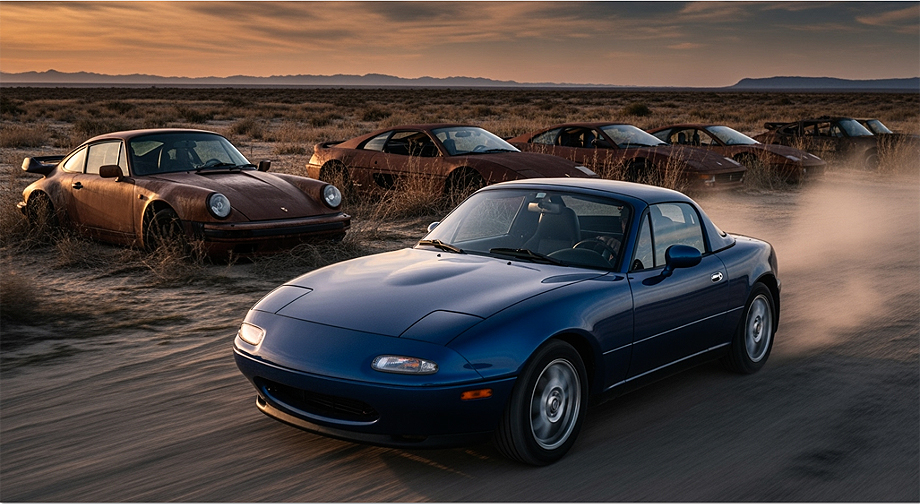 What are the keys to the Miata's success? It gives its driver all of the fun, and all of the sensory inputs, of the old sports cars with none of the problems. Pleasure without undue commitment. Wind in the hair, smile on the face, and no oil spots on the driveway.